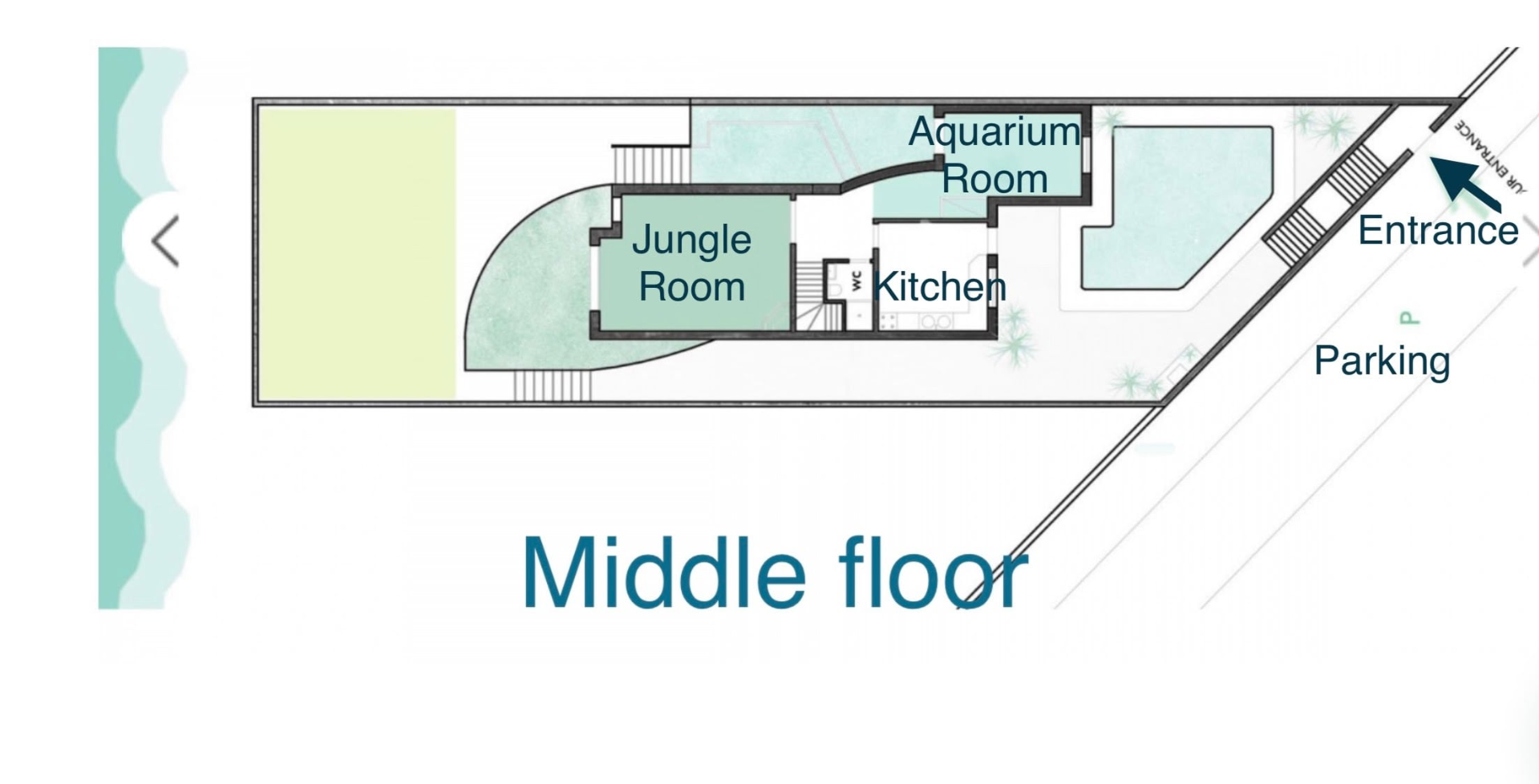 big BBQ & cozy pool & lounge areas, along with a palm tree garden.
